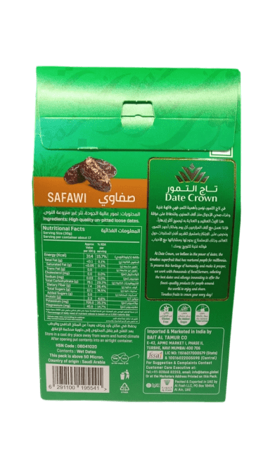 Dates Crown Safawi are premium quality dates known for their rich, dark brown color and soft, chewy texture. These dates are a powerhouse of natural energy, loaded with fiber, iron, potassium, and antioxidants, making them an excellent choice for a nutritious snack. The Safawi variety is not only deliciously sweet but also beneficial for digestive health, boosting immunity, and maintaining energy levels throughout the day.