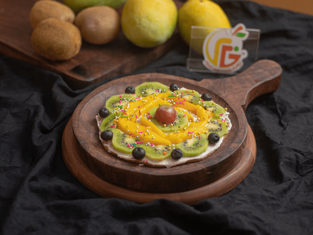 🍕 A vibrant medley of fresh fruits on a crunchy base, topped with creamy cheese and fruit—sweet, colorful, and irresistibly tasty! 🍍🍓
