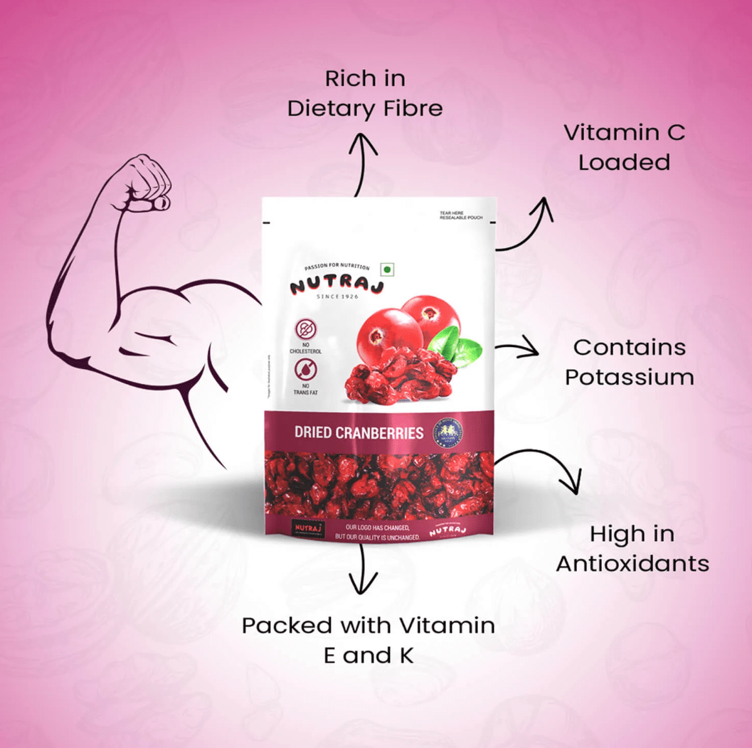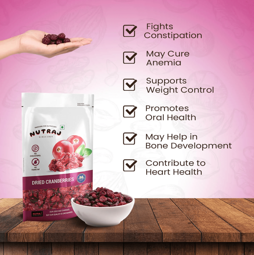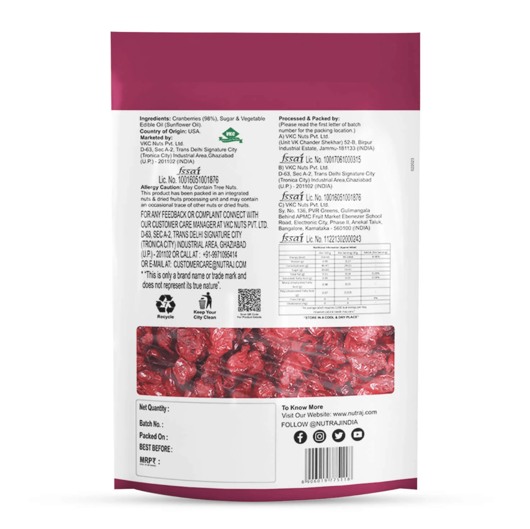 Packed With Antioxidants And Minerals, Nutraj American Dried Cranberries Contain 100% Natural Ingredients And No Preservatives. Cranberries Are Sweet And Sour To Taste And Have Multiple Health Benefits. Whether Morning Or Evening, Keep Your Snack Cravings Away With Nutraj Sweet And Tart Sliced Cranberries, Ready To Eat Anytime, Anywhere.