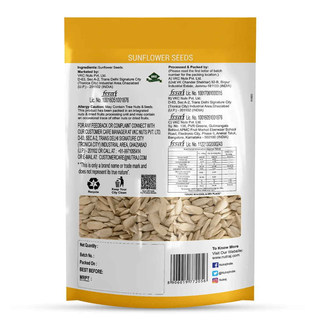 Bring in the finest assortment of premium quality sunflower seeds with Nutraj! These sunflower seeds are carefully handpicked from the flower head and known for their mild nutty and distinct nutritional profile. They are a good source of vitamins E and Bl, antioxidants, healthy fats and zinc and selenium which are useful to support overall health. Thus, grab the goodness for your health with Nutraj Sunflower Seeds.