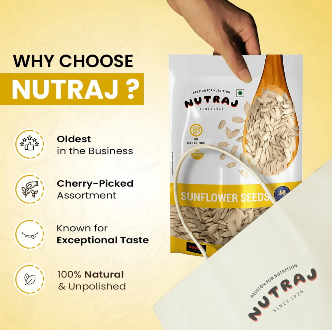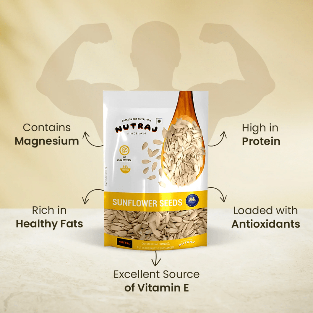 Nutraj Sunflower Seeds offer a mild nutty flavor and are rich in vitamins E and B1, antioxidants, and healthy fats. Enjoy these seeds for a tasty, nutritious boost to your heart health, energy, and immune system.